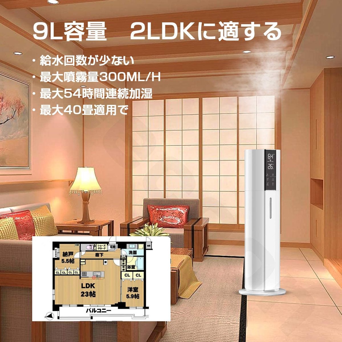 【9L超大容量 2LDKに適する】加湿器は大容量のため給水回数も少なく、手間が省ける 54時間以上運転し続けられ 対応面積も広く、最大40畳適用で、大家族のリビングやお部屋はもちろん、ひとり暮らしのアパート・ワンルームあるいは仕事場でも大活躍 9Lの加湿器の最大噴霧量は300mL/h【湿度設定機能搭載】加湿器は外付け湿度センサーを搭載し、環境によって「湿度設定」ボタンで適当な湿度をコントロール可能。